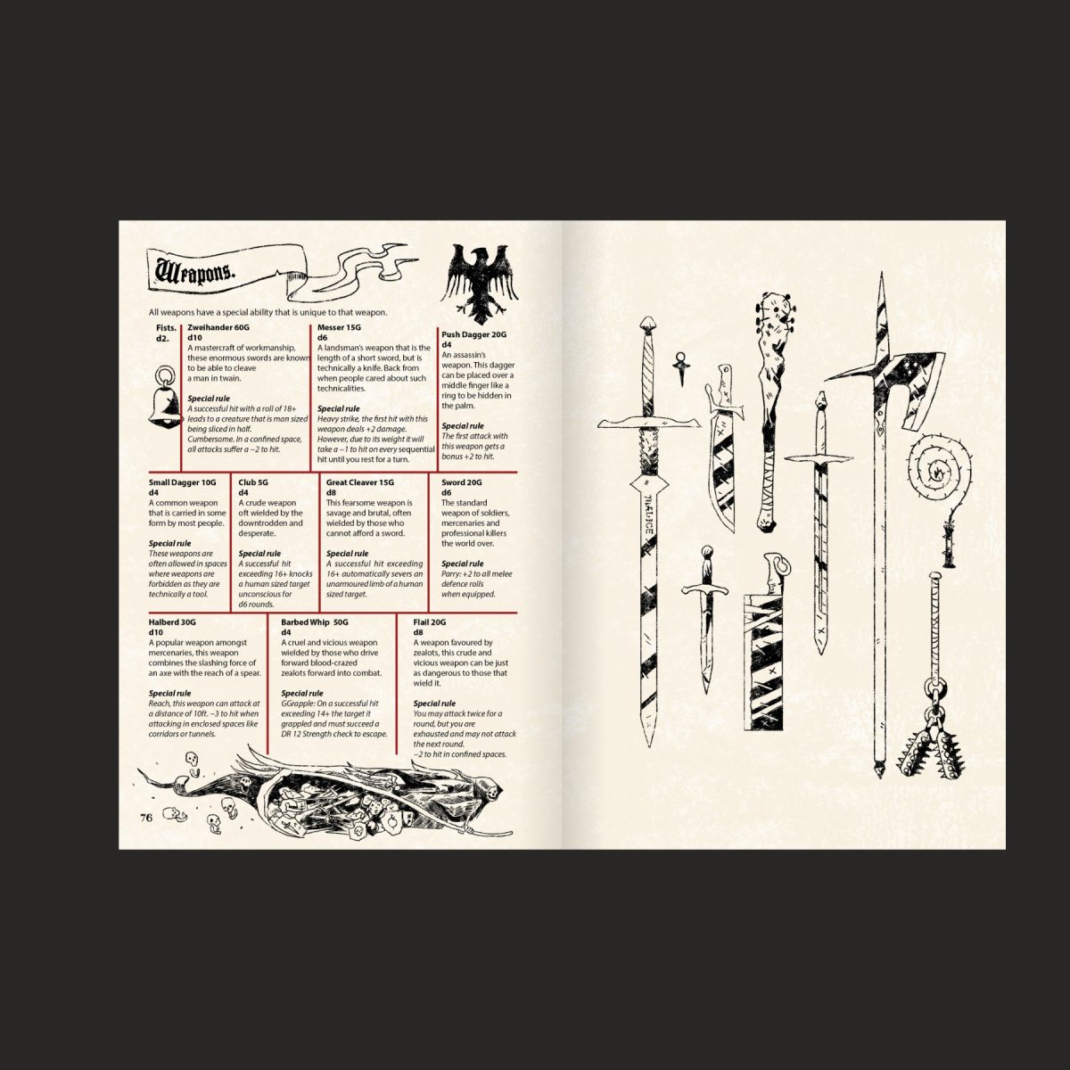 • Wield unique and characterful weapons, each with their own rules and advantages on top of the damage die.