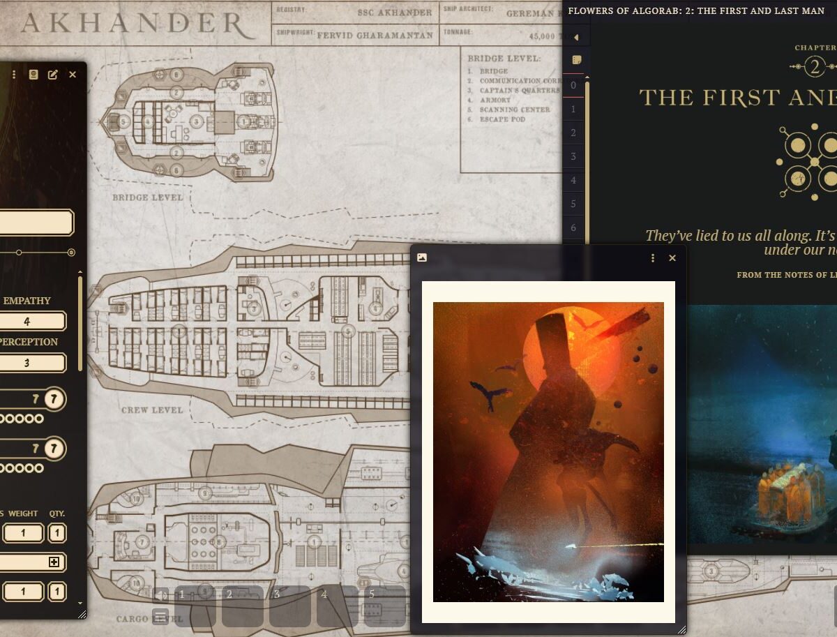 The Flowers of Algorab is a complete campaign for the Coriolis: The Great Dark RPG, where the Explorers will partake in investigations in Ship City, embark on perilous expeditions, and travel down the Hammurabi Arm in search of lost secrets.